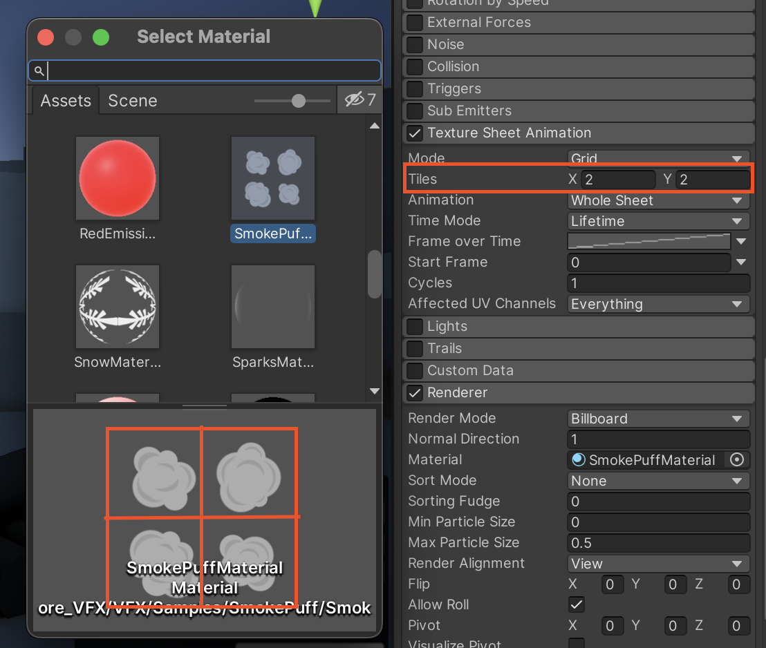 이미지를 2 x 2 형태의 Tile로 잘라 하나의 파티클에 4개의 시트를 번갈아 보여준다.